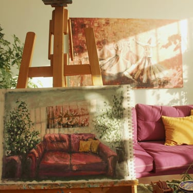 لظروف صحية يتحتم علي أحياناً أن أرسم بألوان الآكريليك ، صنعت له زاوية في البيت مطلة على واجهة شرقية جنوبية ، في الصباح تملأ أشعة الشمس ممزوجة بصوت العصافير المجتمعة على شجرة الكينا المكان فتغمره بسحر خاص يجعله صالحاً للتأمل أيضاً . أما مرسمي فأبقيته للألوان الزيتية لكونه عالي التهوية مما يساعد الأعمال الزيتية على الجفاف بوتيرة أسرع وفي مكان مغلق يمكن إقفاله ، فلا تنتشر رائحة الطلاء في المنزل ، وهكذا تم احتلال البيت بنجاح :)ـ
